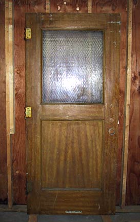 OK, on our first trip to Second Use (the furnishing salvage center next to the South Park waste transfer station), we spotted these old classroom doors. Huge, heavy, with thick opaque glass filled with wire mesh. Turns out they're solid wood doors completely sheathed in metal, which is painted to look like wood! Totally secure, and pretty soundproof, relatively speaking. |