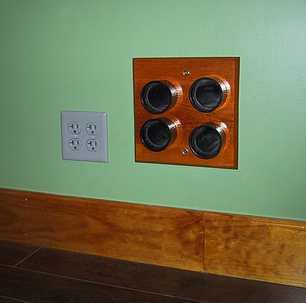 The PVC pass-through tubes finally get their capping plate, a shellacked, bevelled slab of pine with holes punched into it. If I had to do this part again, I'd cut holes in some plywood and build those into the wall to keep the PVC in proper alignment. They're slightly wacky as it is. Oh well! |