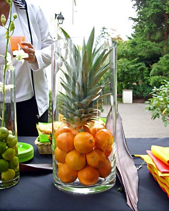 This simple but elegant table setting was the centerpiece of a backyard tropical bar ensemble. The band performed for a small party of revellers in Woodway, Washington, and a good time was had by all.