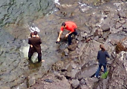 Down at the foot of the falls, a very cold bride and groom pose for their wedding photos. Brrrr, that's mountain run-off they're standing in!