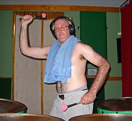 Toucan Dave swelters through a 28-song marathon tenor bass recording session in between gigs. The studio is kept at 92 degrees to make the basses sing and the bassist sweat.