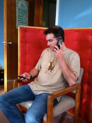 Toucan Rob takes a break from overdubs to catch up on his flirty text messaging management system.